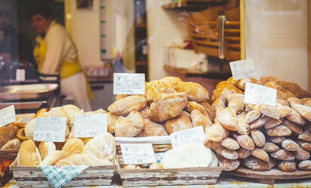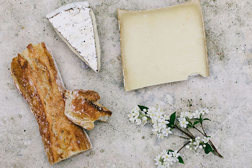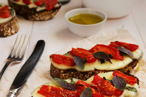 Slices of toasted baguette topped with fresh mozzarella, cherry tomatoes, basil, and balsamic glaze.