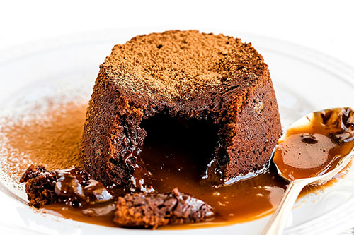 Warm chocolate cake with a molten chocolate center, served with vanilla bean ice cream and raspberry coulis.