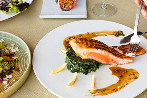Fresh Atlantic salmon fillet seasoned and grilled to perfection, served with lemon-dill sauce and roasted asparagus.
