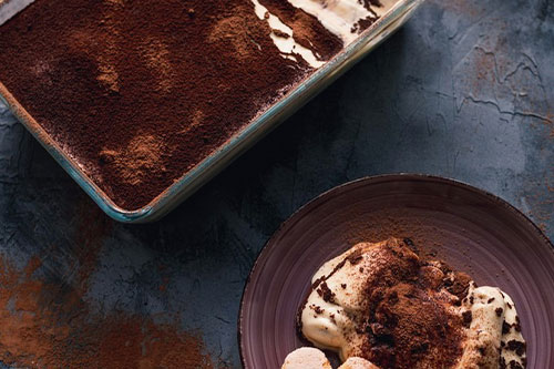 Layers of espresso-soaked ladyfingers and mascarpone cream, dusted with cocoa powder.