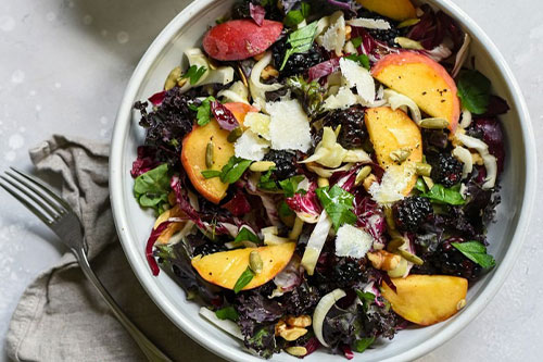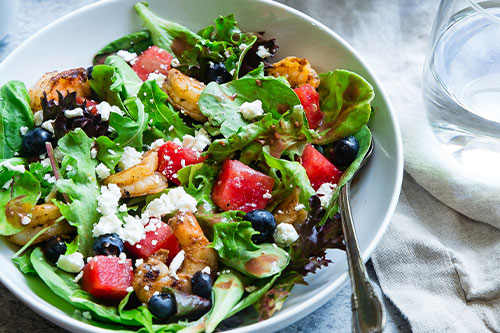 Mixed greens with fresh strawberries, blueberries, goat cheese crumbles, candied pecans, and raspberry vinaigrette.